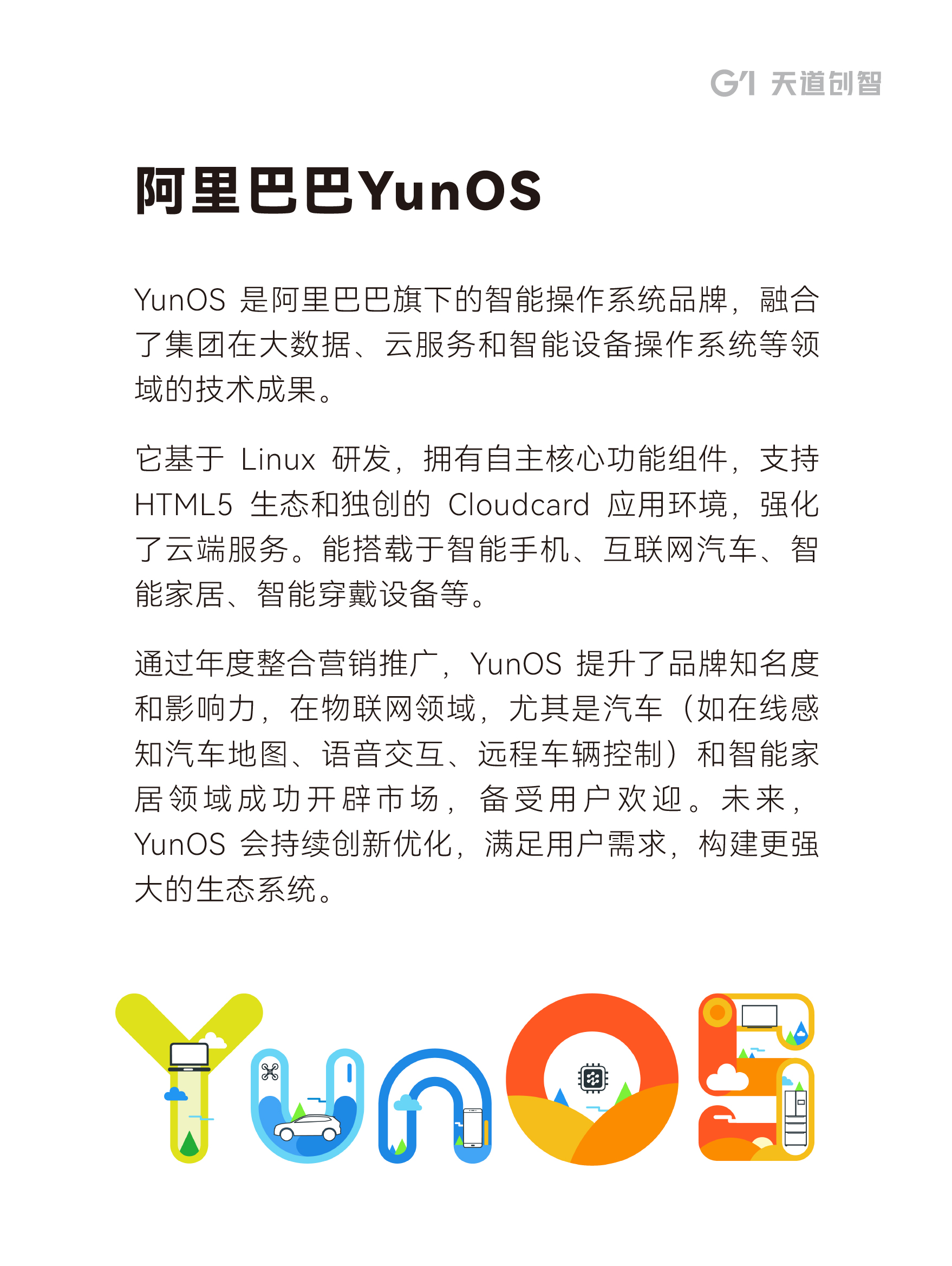 YunOS 是阿里巴巴旗下的智能操作系统品牌,融合了集团在大数据、云服务和智能设备操作系统等领域的技术成果。它基于 Linux 研发,拥有自主核心功能组件,支持 HTML5 生态和独创的 Cloudcard 应用环境,强化了云端服务。能搭载于智能手机、互联网汽车、智能家居、智能穿戴设备等。
